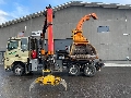 Hyväkuntoinen haketusyksikkö, jossa hakkuri ottaa voimansa kuorma-auton moottorista. Kuljettajan istuin kääntyy näppärästi taaksepäin haketuskäytössä, syöttö kuljettajan puolelta.