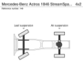 Airbag Fahrerseite, CB-Funk, Drucklufthörner (2) auf Fahrerhausdach, Fahrerhaus: Breite 2,50 m, Federung: Vorderfedern 7,5 t, 2 Blatt, Frontscheibe getönt, Gepäckablage Rückwand oben, Info-Display 12,7 cm mit Zusatzanzeige, Integralheck, Klapptisch in Brüstung, Klimaautomatik, Kühlbox / Kühlschrank, Luftansaugung hinter Fahrerhaus, Montageplatte / Sattelplatte 40 mm für Sattelkupplung, Motorbremse verstärkt, Nebenantrieb MB 131-2c, Rahmenabsenkung ohne Balg-Restdruckregelung, Schnittstelle Flottenmanagement-System, Schubladen unter Brüstung, Sicherungsautomat, Sitze im Fahrerhaus: Fahrersitz Schwingsitz Komfort, Sonnenblende außen, Stahlfelgen 11.75x22.5 (an Vorderachse), Steckdose 12V im Beifahrerfussraum, Steckdose 24V / 25 A im Beifahrerfussraum, Vorbereitung / Schalter Liftachse am Auflieger / Anhänger, Wärmeisolierung zusätzlich, Ölkühler Getriebe